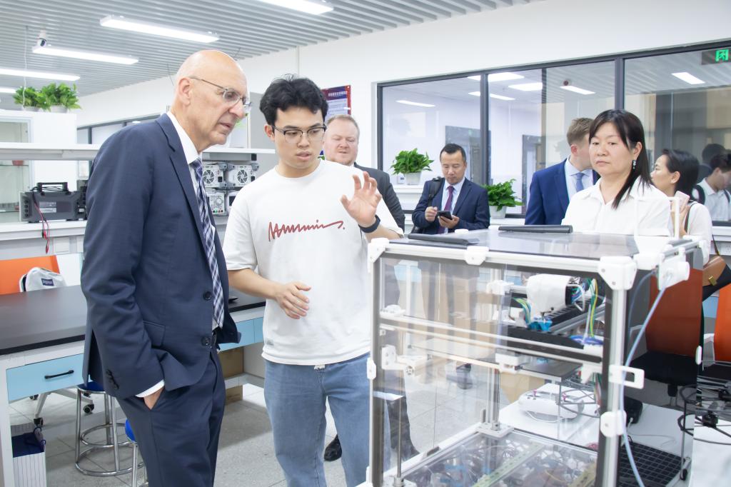 Malcolm Press董事长一行参观湖大—曼城大联合智能传感创新中心,各专业实验室员工负责人介绍了创新中心运行情况并组织员工现场展示科技创新成果。2024级材料科学与工程专业柳斯晨同学介绍了自己负责的“光赋新能,仿生凝雾”项目,展示了智能材料的前沿应用探索。软件工程专业员工团队实时操作工业级3D打印机,展示了硬件与软件技术的融合应用场景。2022级电子信息工程专业刘一帆同学清晰呈现了“智慧垃圾回收系统”运作机制。Malcolm Press董事长对创新中心建设成效给予了充分肯定并现场亲自体验了“机器人联动数据可视化”系统。